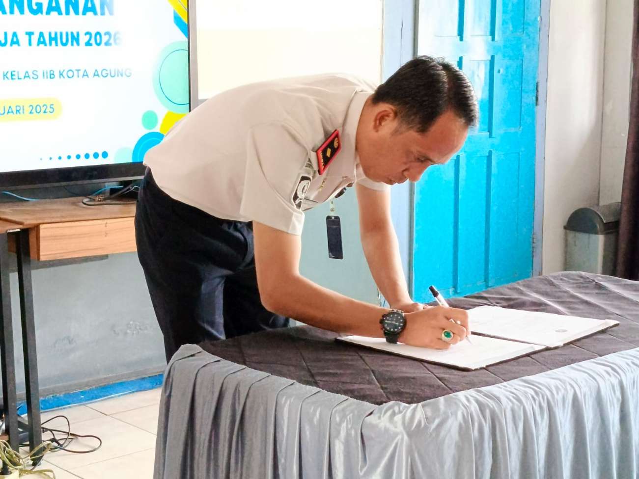 Penandatanganan Perjanjian Kinerja Tahun 2026 dilaksanakan sebagai bentuk komitmen bersama dalam mewujudkan penyelenggaraan pemerintahan yang efektif, efisien, dan akuntabel. Kegiatan ini merupakan bagian penting dalam siklus perencanaan dan pengendalian kinerja, sekaligus menjadi dasar pelaksanaan tugas dan fungsi seluruh jajaran Rutan Kelas IIB Kota Agung selama Tahun Anggaran 2026.