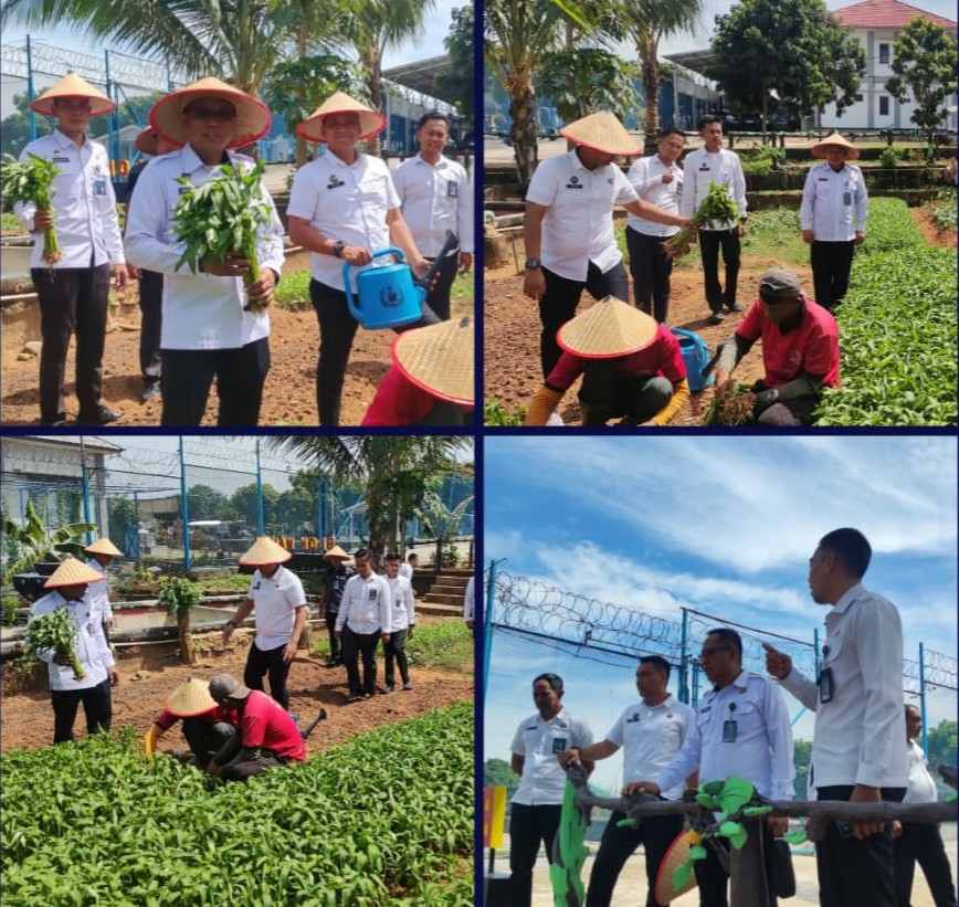Gunung Sugih — Kepala Lembaga Pemasyarakatan (Kalapas) Kelas IIB Gunung Sugih, Sastra Irawan beserta jajaran pejabat struktural melaksanakan kegiatan Penanaman Terong dan sayur kangkung di area lahan pertanian dalam rangka mendukung program pembinaan kemandirian bagi warga binaan, Kamis (30/10/2025).
