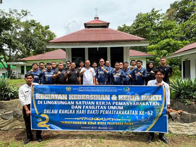 Muara Tebo — Lembaga Pemasyarakatan (Lapas) Kelas IIB Muara Tebo melaksanakan kegiatan kebersihan dan kerja bakti fasilitas umum dalam rangka memperingati Hari Bakti Pemasyarakatan ke-62 yang berlangsung di Mushola At-Taqwa, Pasar Muara Tebo, sebagai bentuk kepedulian sosial sekaligus upaya memperkuat nilai kebersamaan antara jajaran pemasyarakatan dan masyarakat, Selasa (07/04/2026).