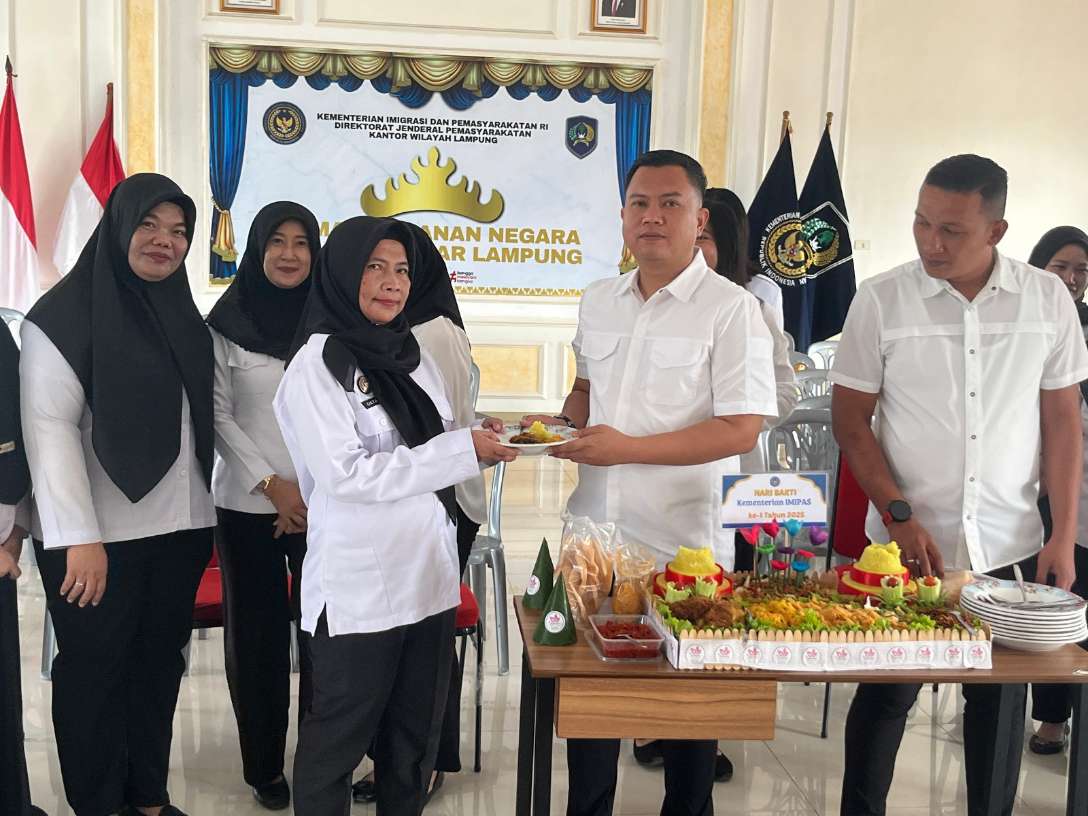Sebagai wujud rasa syukur atas peringatan Hari Bakti pertama ini, Rutan Kelas I Bandar Lampung juga menggelar prosesi pemotongan tumpeng di aula usai pelaksanaan upacara. Pemotongan tumpeng dilakukan oleh Kepala Kesatuan Pengamanan Rutan, Rizqi Putra Sandika, bersama Kepala Seksi Pelayanan Tahanan, Arthayasa Pratama, yang keduanya mewakili Kepala Rutan Kelas I Bandar Lampung.