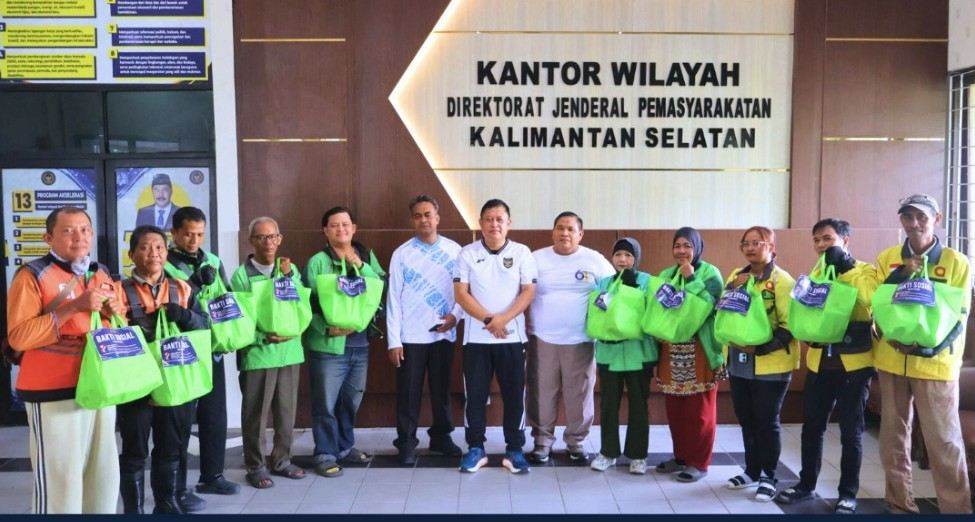 Banjarmasin — Kantor Wilayah (Kanwil) Direktorat Jenderal Pemasyarakatan (Ditjenpas) Kalimantan Selatan menggelar bakti sosial bertajuk ‘Imipas Peduli’ dengan salurkan paket sernbilan bahan pokok (sembako) kepada para ojek online Banjarmasin, Jum’at (14/11).