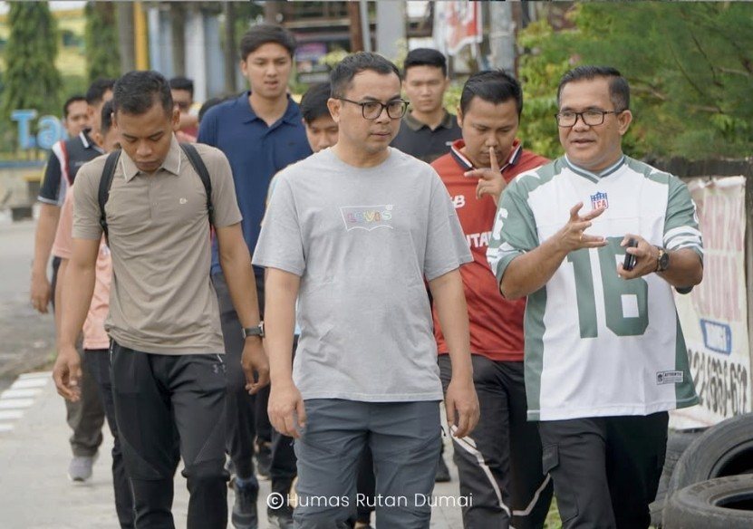Dengan penuh semangat, para pegawai berjalan bersama menyusuri rute hingga ke area Taman Bukit Gelanggang yang menjadi ikon rekreasi masyarakat Kota Dumai.