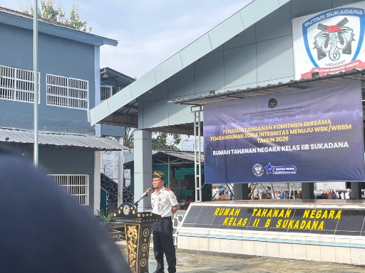 Sukadana — Rumah Tahanan Negara (Rutan) Kelas IIB Sukadana menggelar penandatanganan komitmen bersama pembangunan Zona Integritas (ZI) menuju Wilayah Bebas dari Korupsi (WBK) Tahun 2026. Kegiatan ini dipimpin langsung oleh Kepala Rutan Sukadana, Mohammad Jawad Cirry, dan diikuti oleh Pejabat Struktural dan seluruh pegawai Rutan Sukadana, Selasa (03/02).